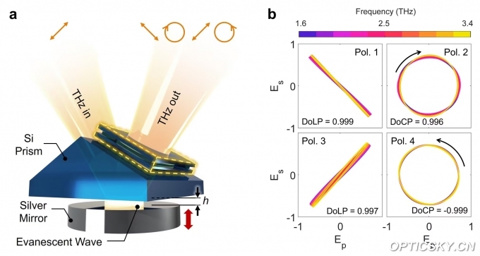太赫兹多功能宽带偏振调制器。(a)为器件结构示意图,(b)为实验测得的四种偏振态输出。
